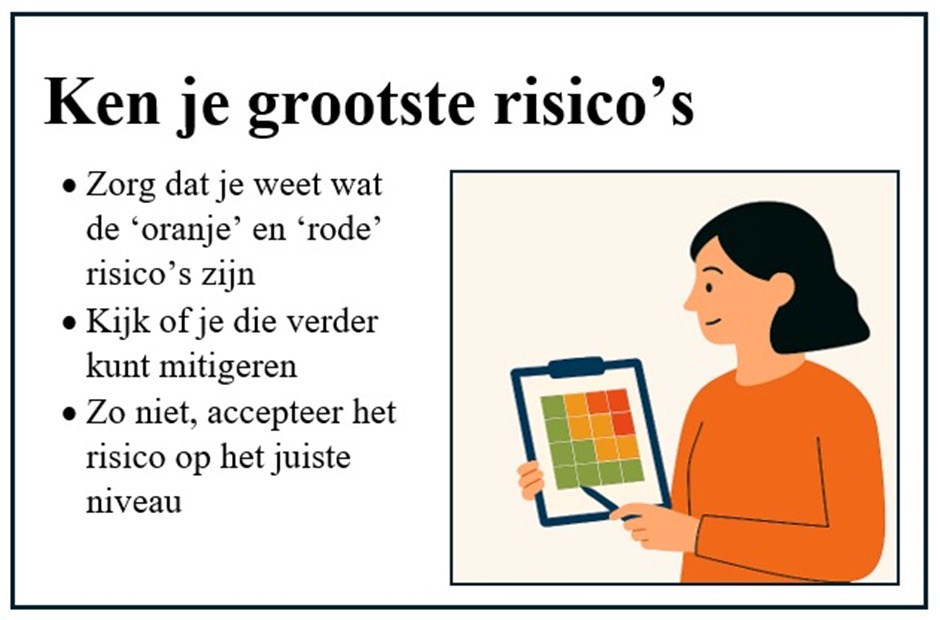 Daarnaast ben je als organisatie niet ‘in control’ als je je grootste risico’s niet kent, niet expliciet hebt geaccepteerd dat ze bestaan of niet hebt bekeken of ze verder te verlagen zijn.