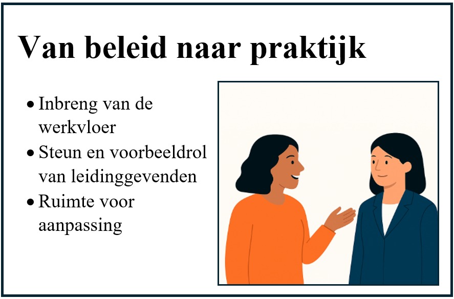 Iedere organisatie pakt dit anders aan en juist dat maakt het interessant om ervaringen te delen. Wat heeft in jullie organisatie geholpen om beleid echt te laten landen in de praktijk?