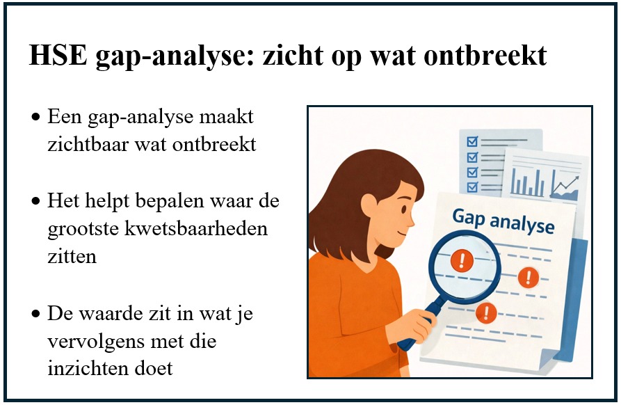 In de praktijk werkt een gap-analyse vooral goed tijdens transities, als input voor een meerjarenplan of na een reeks incidenten. Om iets met de resultaten te kunnen doen is het belangrijk dat er veranderbereidheid en leiderschapsaandacht is. Zonder dat blijft de gap analyse vooral een exercitie voor de HSE-organisatie.